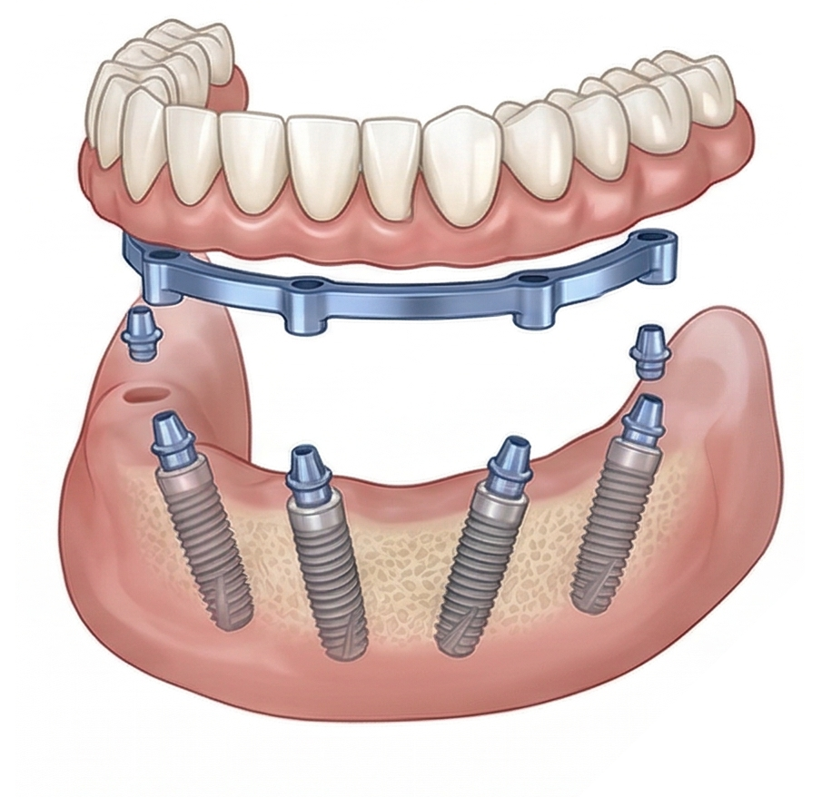 For people with significant tooth loss, advanced decay or failing dentures, All- on-4 treatment provides a complete set of fixed replacement teeth using just four strategically placed implants per arch. This technique offers a secure, stylish and long-lasting alternative to removable dentures.